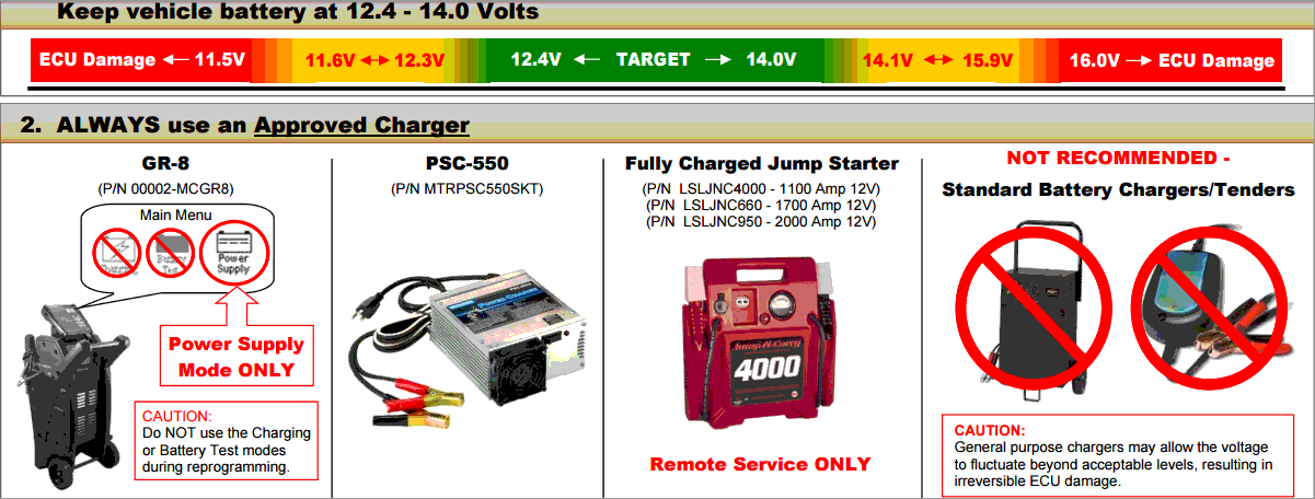 - NOTICE. ECU damage may occur if the correct battery charger mode setting is NOT used".
