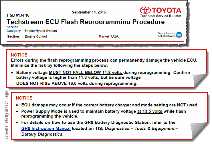 Инструкция "ECU reprogramming with CUW" пишет, что "charge vehicle 12V battery completely before reprogramming" и её вторит TSB "REPROGRAMMING METHOD OF ENGINE ECU USING ITII" (2015): "Make sure that the battery voltage is 12 V or more before starting to reprogram the ECU". И в TSB сообщает, что "If the reprogramming is conducted with a weak vehicle battery, an auxiliary charge does not prevent a voltage drop, which may disable the ECU in reprogramming and damage it.".