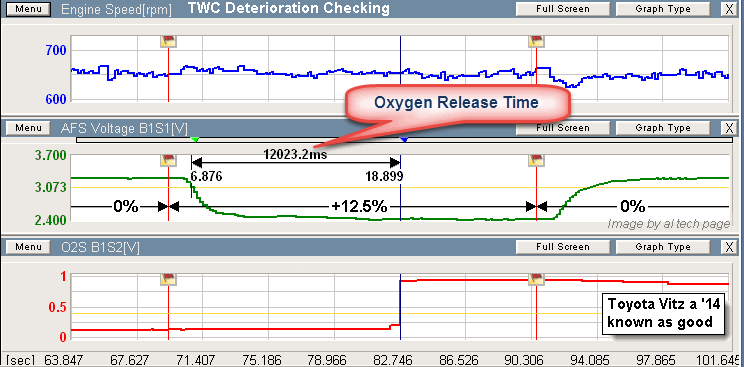 Например, этот явный предвестник DTC P0420 этого Lexus GX470 - кода неисправности катализатора Bank 1 хорошо заметен на этом скриншоте:После уменьшения напряжения датчика состава топливно-воздушной смеси ниже значения 3,1В в результате переключения активного управления составом топливно-воздушной смеси с -12,5 % на 12,5 % (или с -12,5 % на 25 %) напряжение кислородного датчика (после катализатора) не превышает 0,4 В в течение более 10* секунд.
