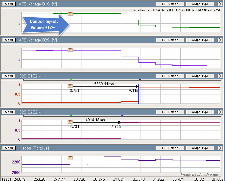 • С помощью этого теста, сверяя соответствующие временнЫе интервалы, можно проделать и более глубокую проверку A/F Ratio Sensors и HO2S.