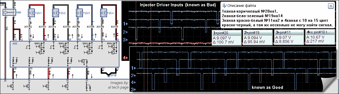 Для будущих проверок учитывайте. что форсунки управляются "с двух сторон", поэтому осциллограф следует подключать к обоим её контакатам. 3-й и 4-й каналы осциллоскопа подключайте к контакту "Open Circuit Check Output" и "Injector #". Сделав записи для каждого цилиндра в отдельности, можно будет определить состояние драйвера.
