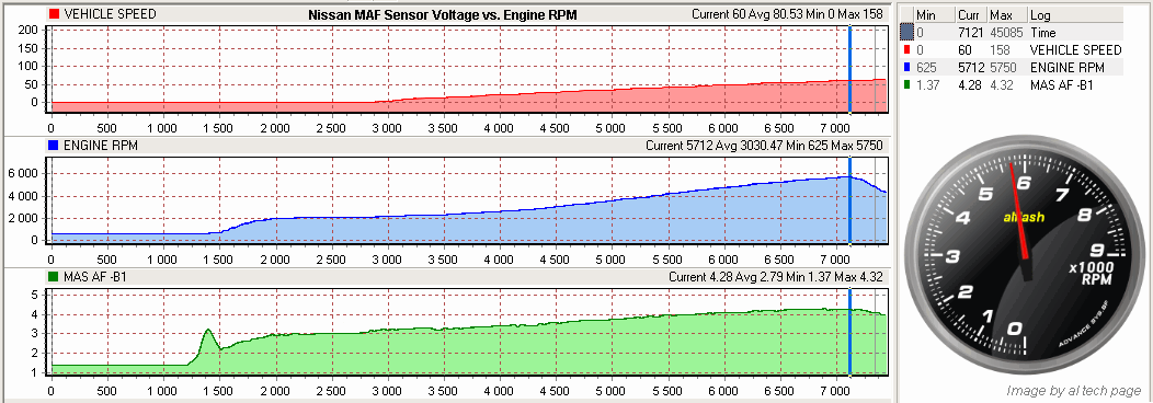 А в этом, данные MAF (в вольтах и гр/сек) при различных режимах движения Mazda3 (LF 2.0L Engine) и "внутренности Nissan MAF