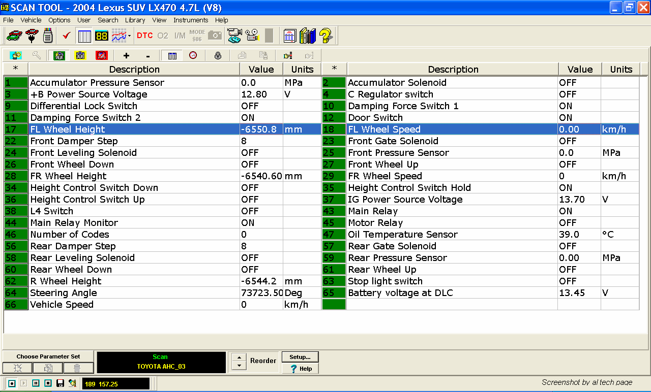 Здравствуйте. LX 470-2003г неработает регулировка жесткости подвески AVS, регулировка кузова по высоте работает. Что сегодня успел сделать, датчик положения кузова один (передний левый) заржавел заменил от RX 330, остальные датчики и тот что заменил проверил осциллографом сигнал чистый без "дребезжаний". Две передние стойки потеют и уже давно, data list techstream записал, поднимая и опуская машину и на ходу переключая режим жесткости. Переключатель спорт, комфорт работает, в дате отображается.