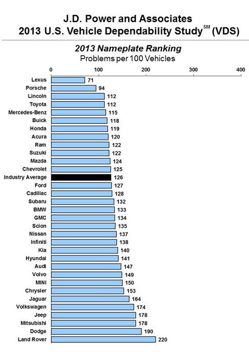 Данные J.D.Power о надежности 3-летних авто в 2013 и в 2012 годах: