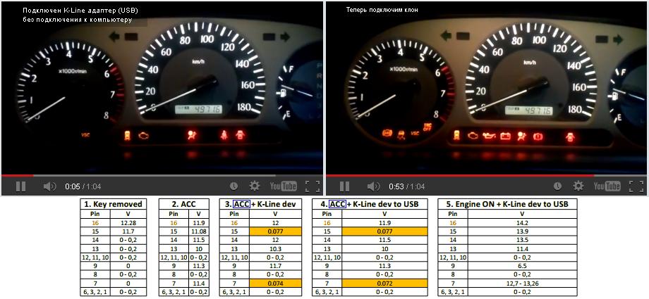 1. Евгений, не сочтите меня занудой, но в табличках No. 3 и 4 указано, что "Acc +". Плиз, уточните при каком положении замка зажигания они сделаны (при только "Acc." или при "Ign. (ON)"?2. Уверен, что НЕвключение индикаторов3. Подключаю K-Line адаптер, включаю зажигание, замеряю. Часть ламп приборки не зажглась.