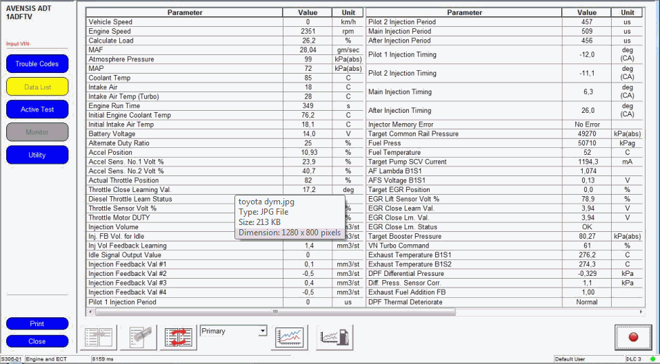 Toyota Avensis D4D, 2.0, 1AD-FTV, 2008 г. На холостых оборотах дыма не заметно, после поездки даже на короткую дистанцию начинает дымить. Дым с запахом не сгоревшего дизельного топлива. В приложении скрины Techstream Data list при дыме: http://images18.fotki.com/v329/photos/5/3049325/12507561/photo-th.jpg