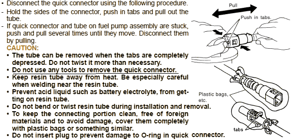 Поскольку а) "клипсы" из пластмассы, б) скорее всего, грязь попавшая под "выступы" (the Tabs), мешает их перемещению, то единственный способ облегчения рассоединения - очистка этого соединителя (спреем и сж. воздухом).p.s. Особо подчёркивается запрет на использование инструмента для рассоединения ("Don't use any tools to remove the quick connector").
