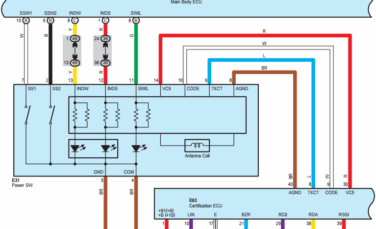 Когда водитель (или пассажир), имеющий при себе ключ, садится в автомобиль и нажимает педаль тормоза *1 (педаль сцепления *2) при нажатом выключателе зажигания, главный ЭБУ кузова определяет начало процедуры запуска двигателя и направляет на ЭБУ сертификации сигнал запроса сертификации. После получения этого сигнала запроса сертификации ЭБУ сертификации направляет сигнал запроса на внутренний генератор электронного ключа. После получения сигнала запроса внутренний генератор электронного ключа направляет сигнал запроса с целью определить, находится ли ключ в салоне автомобиля. Получив этот сигнал запроса, ключ направляет на приемник системы управления дверью ответ в виде идентификационного кода, содержащий код отклика. После получения этого идентификационного кода ЭБУ сертификации выполняет его анализ. Если внутренняя сертификация выполняется успешно, ЭБУ сертификации направляет ответный сигнал о прохождении сертификации. Когда главный ЭБУ кузова получает этот сигнал, включается размыкающее реле ACC, а затем по очереди включаются реле IG1 и IG2. В этот момент горит зеленый индикатор включения двигателя. Затем ЭБУ сертификации проверяет изменение режима работы источника питания и направляет на главный ЭБУ кузова управляющий сигнал разблокировки рулевого управления. После получения этого сигнала главный ЭБУ кузова подает питание на ECU блокировки рулевого управления. Затем ЭБУ блокировки рулевого управления (через блок идентификационного кода) подтверждает, что ЭБУ сертификации проверил управляющий сигнал разблокировки рулевого управления, и с помощью привода рулевого управления разблокирует механизм рулевого управления. После разблокировки механизма блокировки рулевого управления на ЭБУ сертификации подается сигнал о завершении разблокировки. Получив этот сигнал, ЭБУ сертификации направляет в блок идентификационного кода команду на выключение. После получения этого сигнала блок идентификационного кода удостоверяется в том, что ЭБУ сертификации проверил управляющий сигнал выключения, и направляет на ECM управляющий сигнал выключения иммобилайзера.