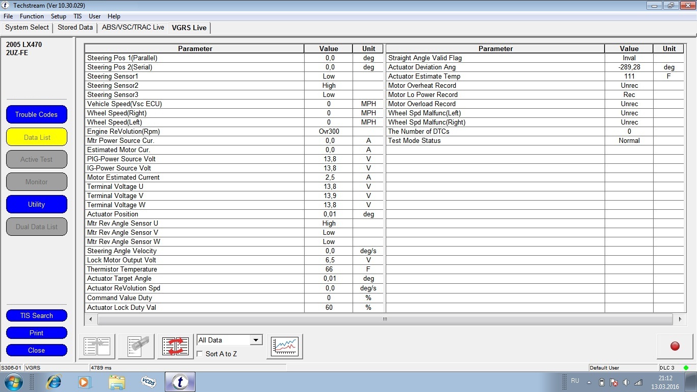 2. Почему все таки происходит самопроизвольный поворот рулевого колеса? Если бы данная проблема имела массовый характер и был виноват ЭБУ системой VGRS то имелся бы сервисный бюллетень. Но, применительно к данному автомобилю имеется отзывная компания связанная с проблемой рулевого вала имеющая только механическую составляющую. Никакой информации о самопроизвольном повороте руля из-за электрических проблем нет. Интересна главная особенность которую отмечают большинство владельцев LX470 - падение напряжения акб. В моем случае тоже было падение напряжения ниже отметки 9.5В. Но при любом раскладе алгоритм поведения блока при "просадке" питания явно не верен и не безопасен для водителя.
