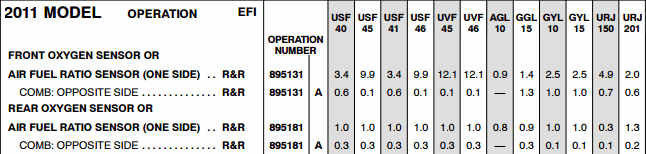 Согласно нормам времени на выполнение работ в GX460 (URJ150) 2011 г.в. на замену Air Fuel Ratio Sensor отводится 4.9 н.ч., на замену Rear Oxygen Sensor - 0.3 н.ч.