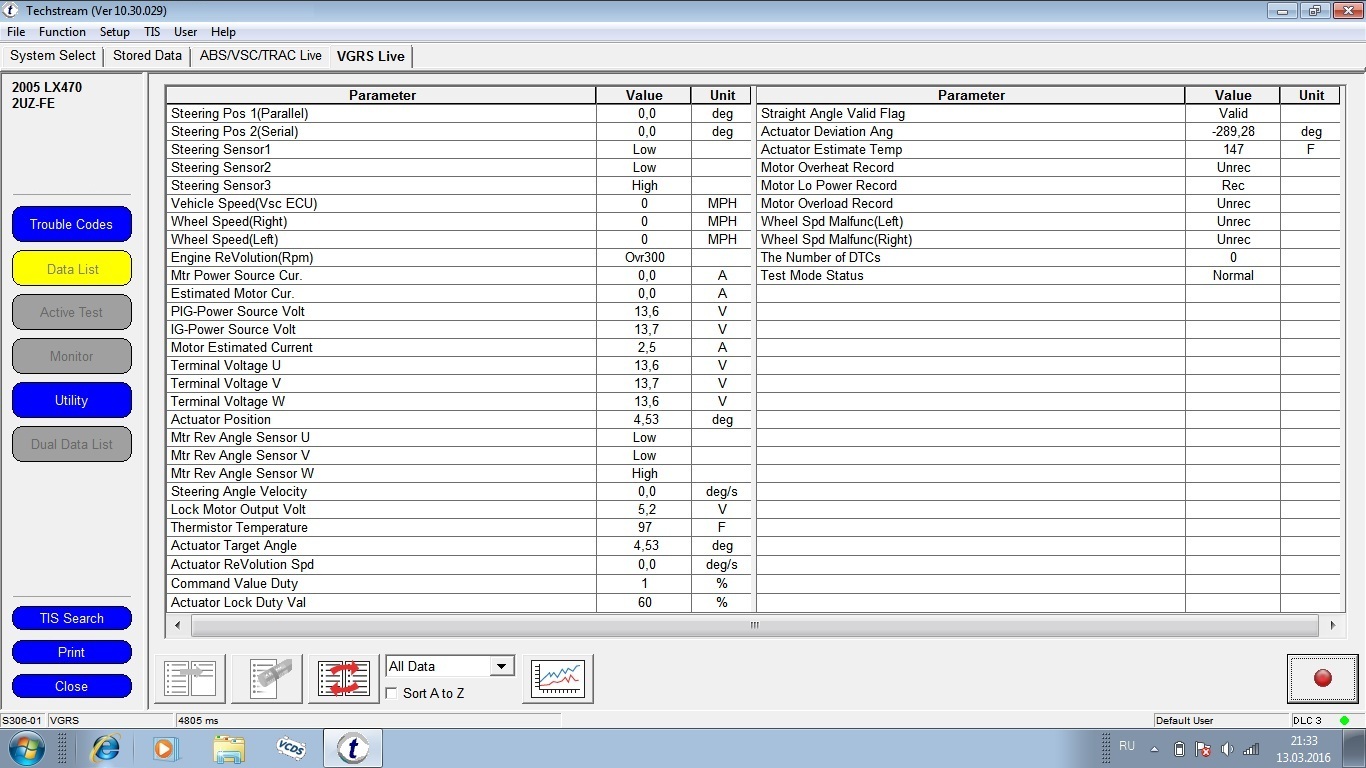 2. Почему все таки происходит самопроизвольный поворот рулевого колеса? Если бы данная проблема имела массовый характер и был виноват ЭБУ системой VGRS то имелся бы сервисный бюллетень. Но, применительно к данному автомобилю имеется отзывная компания связанная с проблемой рулевого вала имеющая только механическую составляющую. Никакой информации о самопроизвольном повороте руля из-за электрических проблем нет. Интересна главная особенность которую отмечают большинство владельцев LX470 - падение напряжения акб. В моем случае тоже было падение напряжения ниже отметки 9.5В. Но при любом раскладе алгоритм поведения блока при "просадке" питания явно не верен и не безопасен для водителя.