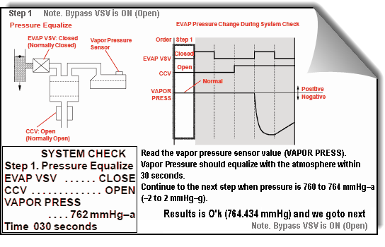 А теперь пошагово рассмотрим работу системы при активном тесте*, не забывая, что DTCs P0440 (Evaporative Emission Control System Malfunction), P0441 (Evaporative Emission Control System Incorrect Purge Flow), P0446 (Evaporative Emission Control System Vent Control Malfunction).