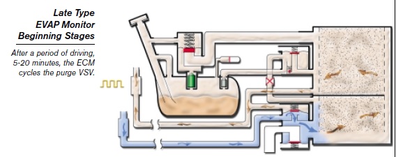 The Late Type EVAP System, also known as the Intrusive type, was developed to meet the very stringent, mandated standard of detecting a hole 0.020 inch (0.5 mm). This system uses many of the same components as the early type EVAP system. Purge, vacuum relief, pressure relief, and ORVR operations are identical to the early type. Refer