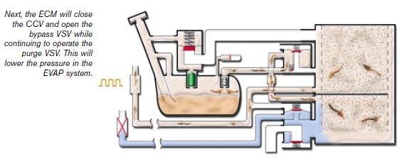 ... Next, the ECM will close the CCV and open the bypass VSV while continuing to operate the purge VSV. This will lower the pressure in the EVAP system