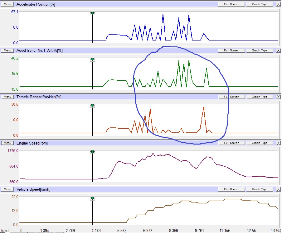 Товарищ предложил тест - в общем когда машина медленно едет он быстро до половины нажимал педаль газа много раз. Результат: его авто реагировало на все нажатия; мое авто - только при первых нажатиях потом как будто не бы на педаль не нажимали. При этом "Дата лист" показывал что как будто ничего не происходит... Я это не записывал но если надо могу сам повторить и записать.