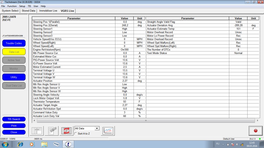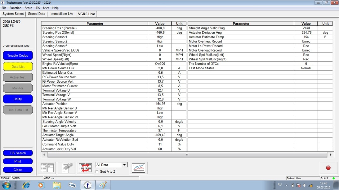 а) Хозяин поведал что при движении прямо руль стоит влево (градусов на 15). Соответственно если сделать руль прямо, автомобиль уводит вправо. С таким дефектом авто было куплено и доставлено ко мне. Та самая лампа VGRS иногда зажигалась и гасла сама, причем редко.