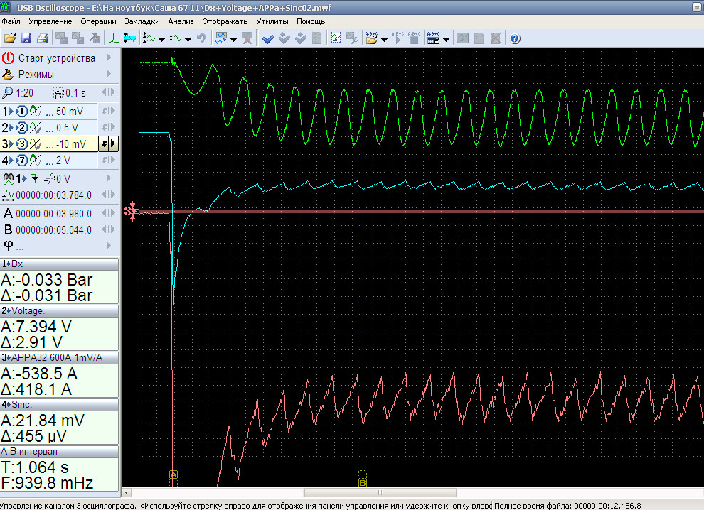 Владелец очень просил измерить компрессию - говорит, что мотор "кушает" ок. 0,5 л масла от замены, до замены. Ответил ему, что компрессия не покажет причину и, поэтому, ограничились измерением тока на стартерной прокрутке. Хотя сигналы Dx, Voltage и APPA 32 не идеально ровные, но, на мой взгляд, вполне приличные.