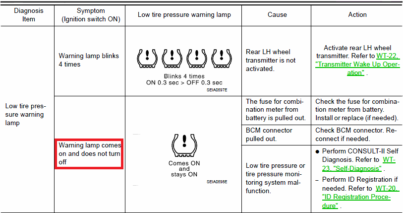 Стоит проверить нынешнее состояние Tire pressure information, как описано на стр. 157 (p.4-7) и стр. 165 (p.4-15) и обратите внимание на стр.278 (p.6-2) и далее.