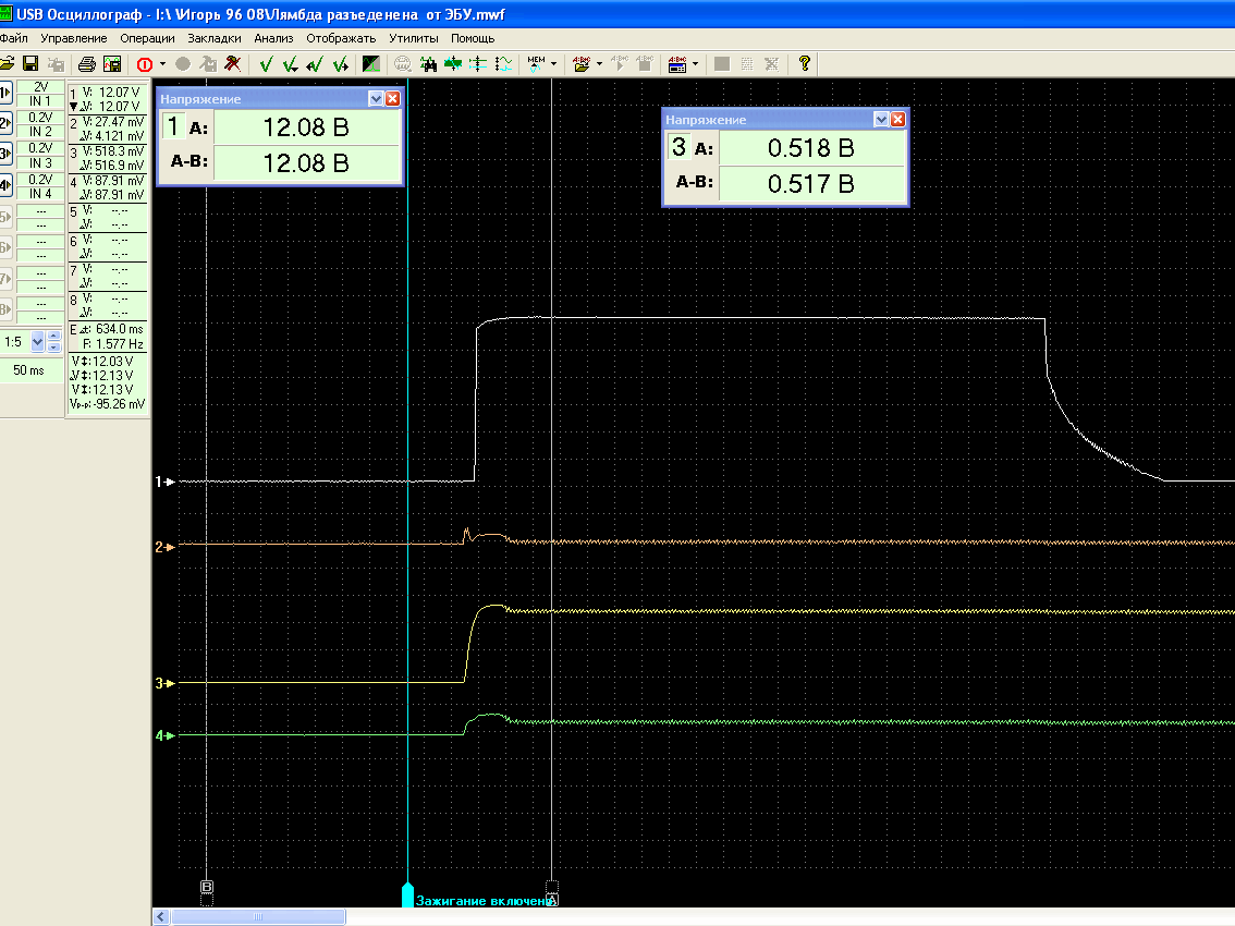 Правда, в моем случае, я наблюдаю опорное 0,5 вольта, (а не 1,6 в), и на отсоединенном разъёме проводки авто, которая идет к ЭБУ.