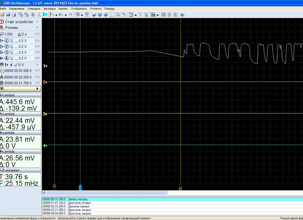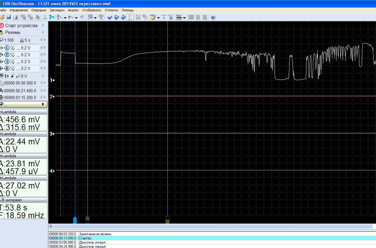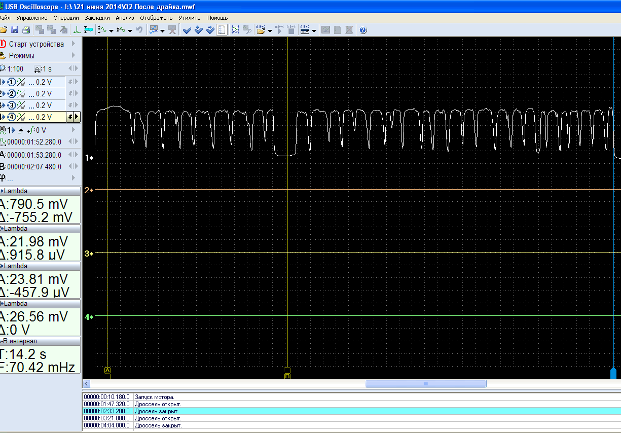 И главное, где осциллограмма напряжения подключенного O2S при проверочном обеднении/обогащении смеси, а так же при ХХ, ускорении, замедлении прогретого двигателя?