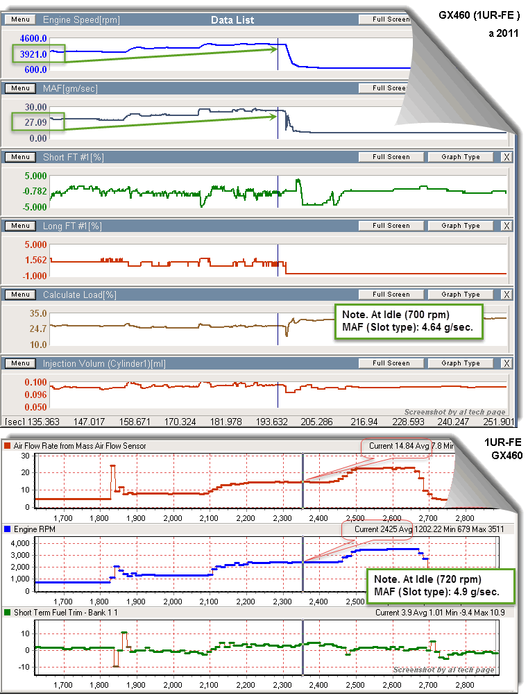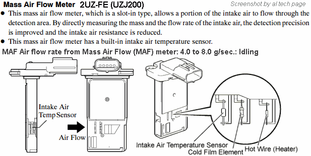 Кстати, ни разу не встречал ссылку(и) на RM, TSB, Tech Tip Toyota и/или описания Denso/Hitachi/Delphi, в которых был бы рассмотрен параметр "быстродействие MAF" или описан таковой способ его проверки и указаны численные критерии его оценки... Равно как и не встречал проверок аля "измерение времени переходного процесса при включении зажигания" и/или проверки "скорости реакции датчика".