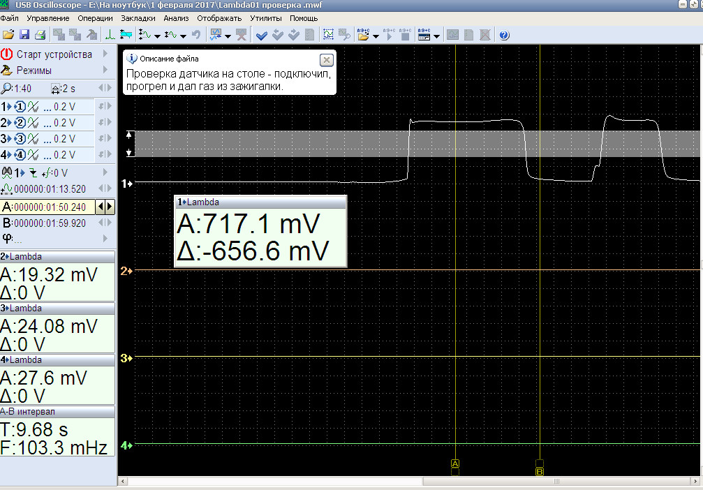 Тогда я подключил Постолограф к сигнальному выводу первого О2 датчика. На ХХ все хорошо, а вот на повышенных смесь так и осталась богатой. Думаю, что причин богатой смеси может быть много: