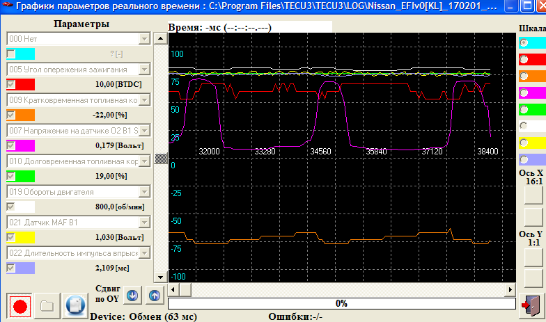 ЛинейкА прокрутки внизу, а слева значения выбранных параметров. Отсчет значений (масштаб вертикальная шкалы - "ось Y") выбирается справа (на скрине почему-то указан первый "канал", который не ассоциирован ни с одним из доступных параметров).Саша-Ирпень писал(а):Честно говоря я так до конца и не разобрался с возможностями программы TECU3. ... И, я так и не понял - как в этих красивых графиках увидеть конкретные величины значений переменных в определенной точке? И какие, вообще, возможности этой программы?alflash писал(а):...А еще лучше, показать лог (например, в формате .csv), поскольку Вы теперь во всеоружии...