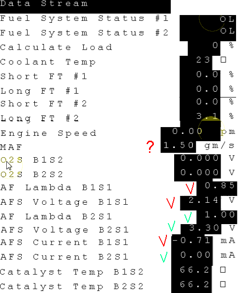 б) напряжение на O2S B1S1 было отлично видно в Data Stream и полностью соответствовало проверке с помощью вольтметра,