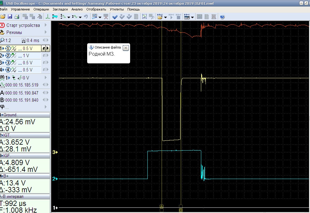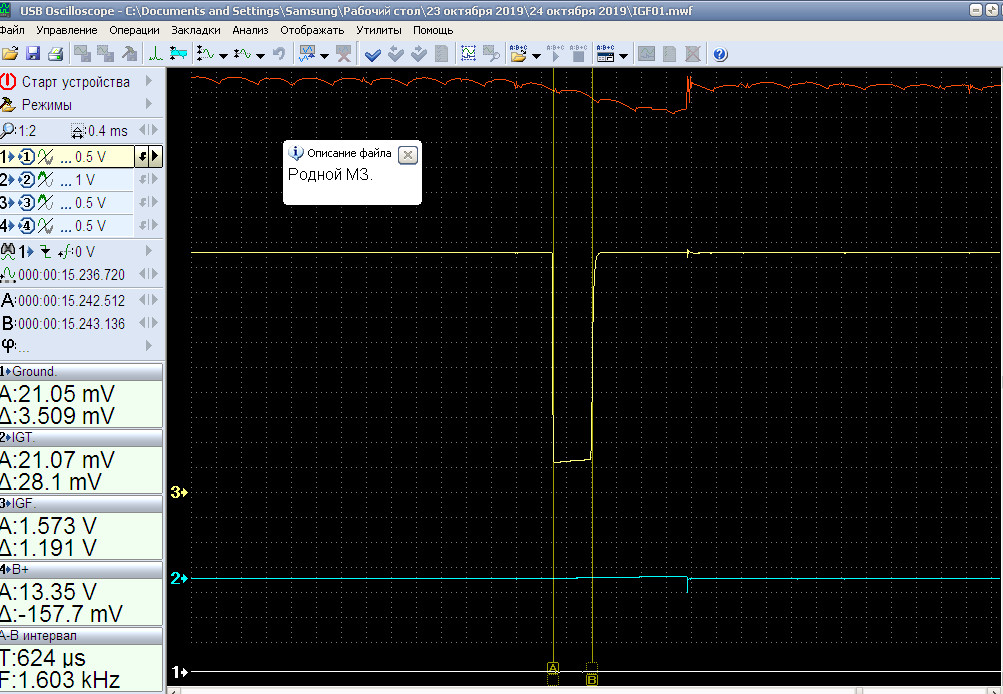 Хотя и не очень равномерно, но все таки все цилиндры работают. Для надежности меняю местами первую катушку со второй и неисправность тоже переходит во второй цилиндр. Звоню владельцу, заказываю катушку и продолжаю проверки дальше. Скрипт-скриптом, но ведь можно ещё посмотреть и сигналы IGF и IGT. Опять подключаю постолограф, но, ярко выраженного дефекта в первом цилиндре не вижу. Да и на слух работа мотора выровнялась. Скорее всего, мотор прогрелся, улучшились условия для воспламенения смеси и воспламенение нормализовалось: