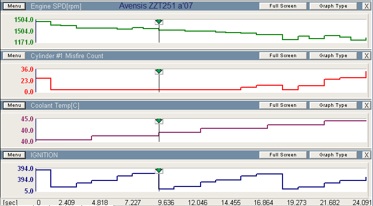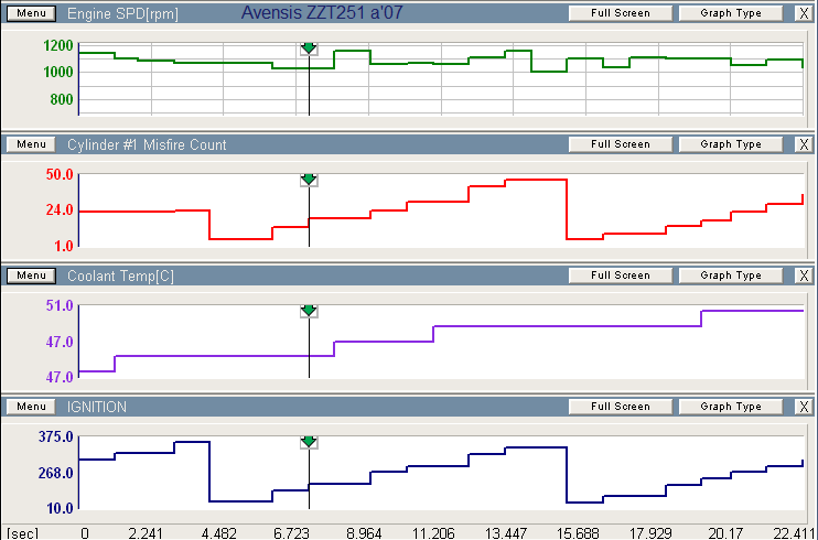Снял бардачек. Увидел чрезвычайно удобные разъёмы. (Вот ведь японцы какие молодцы!) Нашел в Autodata раздел pin data. Они пишут, что ДПКВ на разъёме D, pin 27. Подключил Плстолограф - действиьельно ДПКВ! Попробовал засинхронизироваться по импульсам управления модулем зажигания. Но скрипт не захотел считать. Тогда подключил МЗ через свечной провод и все заработало. Ну вот, "бесполезный" скрипт показал, что проблема в 1-ом цилиндре.