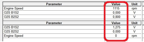 Еще один интересный момент, это поведение задних кислородных датчиков при включенном зажигании и уже прогретом двс включая повышенные обороты. При работе двс ситуация с показаниями задних датчиков кардинально не меняется - Bank 1 висит в бедной смеси, а Bank 2 висит в богатой смеси (исключение составляет лишь момент сброса газа и отключение из работы форсунок, тогда Bank2 все же удосуживается уходить вниз по напряжению, как и положено). При включенном зажигании ситуация с показаниями мягко скажем тоже не очень стандартная...