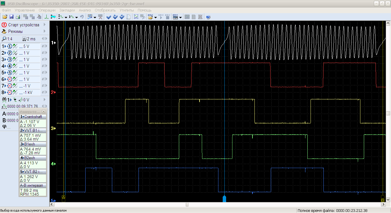 Саша-Ирпень писал(а):Я не знаю, осциллограмма какого датчик у вас по 5 каналу, но если это датчик Холла, то нижний уровень у него высоковат. (1,3 вольта - это много).