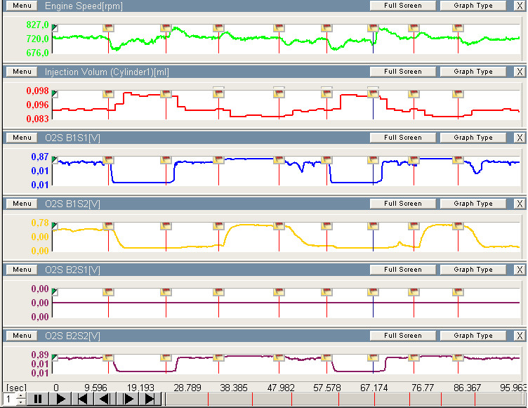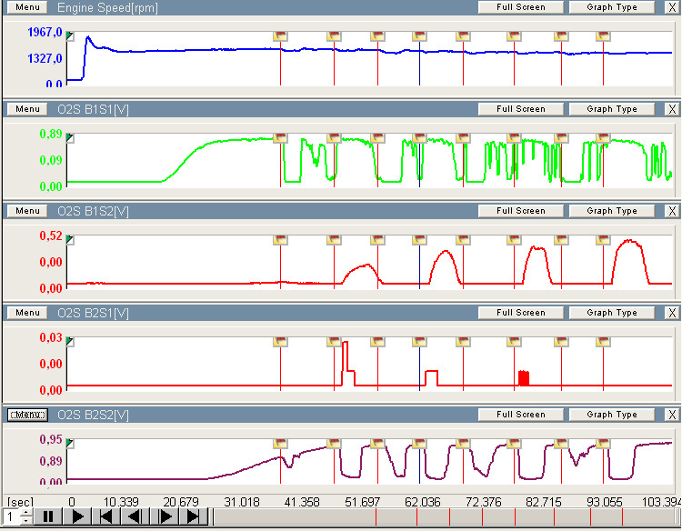 Активный тест A/F Control подтвердил, что B2S1 вобще не реагирует на изменение состава смеси. А вот оба задних датчика выдают уж очень похожие сигналы. Или они оба рабочие, или "умельцы" выбросив каты поставили эмуляторы лямбды:
