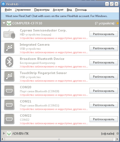 Update. К сожалению не удалось подключение с помощью ПО FlexiHub.