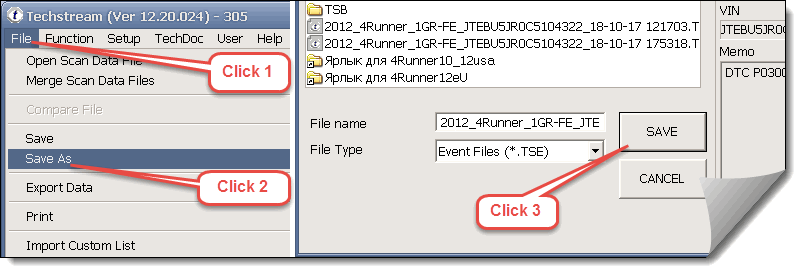 По умолчанию файлы .TSE сохраняются в C:\Documents and Settings\All Users\Документы\Techstream\User\Default_User
