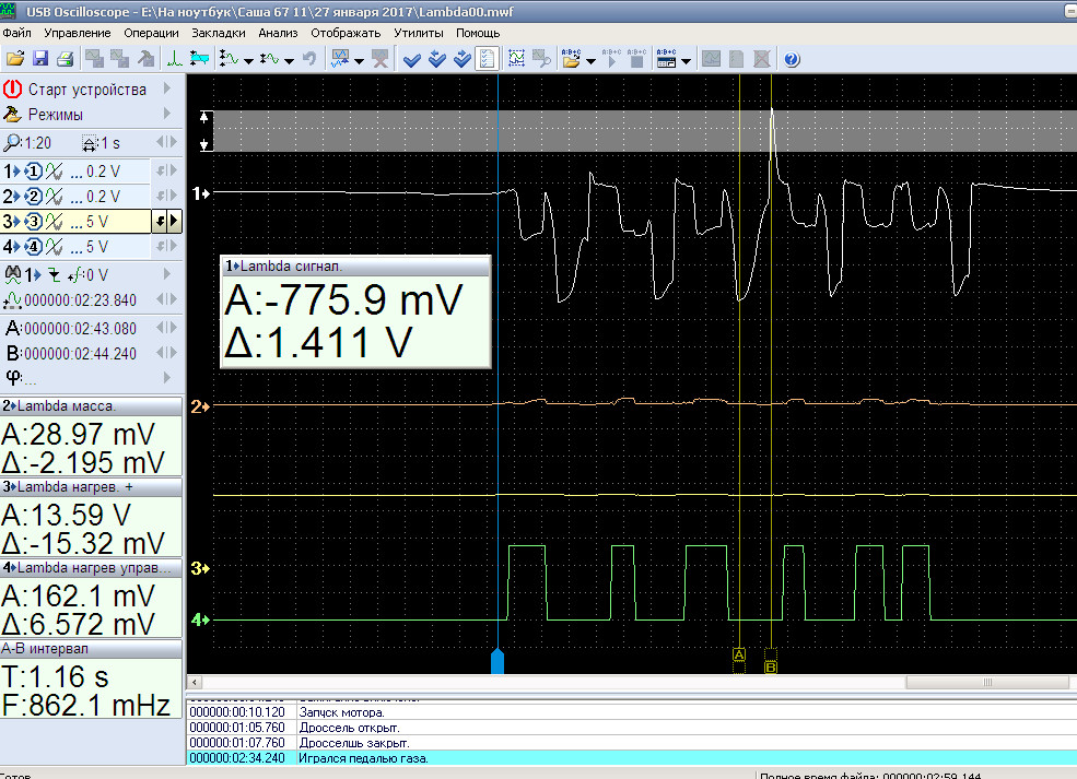 Для проверки растянутости цепи ещё снял сигналы датчиков колена и распреда.