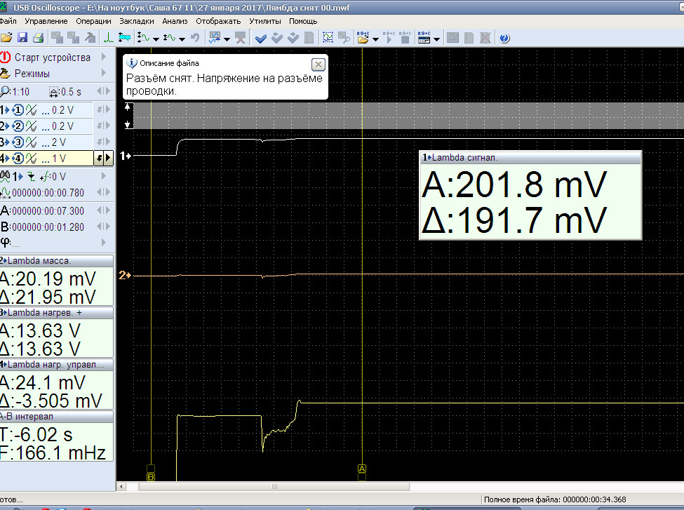 Подключаю сканер ... "Автоком" показал 44 переменных, но большинство из них малоинформативны: Кодов DTC нет, коррекция 130 -140%, расход воздуха в принципе в норме, впрыск слегка завышен - 2,5 мс. А вот лямбда, (там переключающийся О2 датчик), ушла в отрицательные значения.
