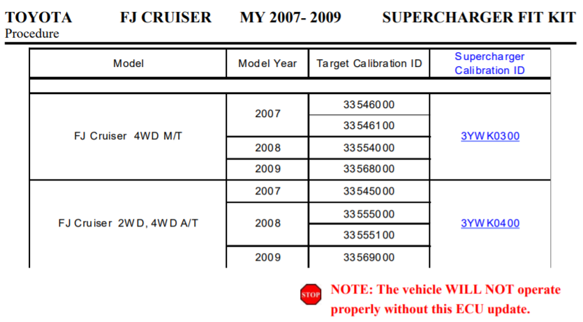 Хотя это авто цвета WHITE/BLACK CHERRY PEARL имеет Date of First Use: 10/16/2006, тем не менее оно Model Year: 2007 и к нему относиться это предупреждение, выделенное Тойотой красным, из описания "2007-2009 FJ Cruiser Supercharger Fit Kit PTR29-35093 (Fit Kit) Rev. F" (Issue: F 07/08/11) :