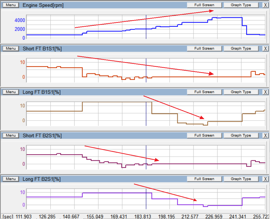 Если я правильно понимаю, эти данные вашего авто прямая иллюстрация одной из ситуаций в том "обучающем" скрине. Т.е. по мере увеличения rpm топливные коррекции улучшаются.