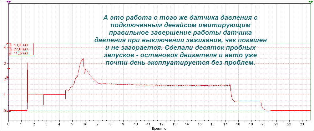 По напряжению, сам не совсем понял, когда подключал девайс на столе было одно при установке на авто другое. Иглу осциллографа подключал в разъём ЭБУ. Зажигание выключается в момент начала первого резкого спада напряжения, потом что-то щёлкает под капотом и получается второй спад.