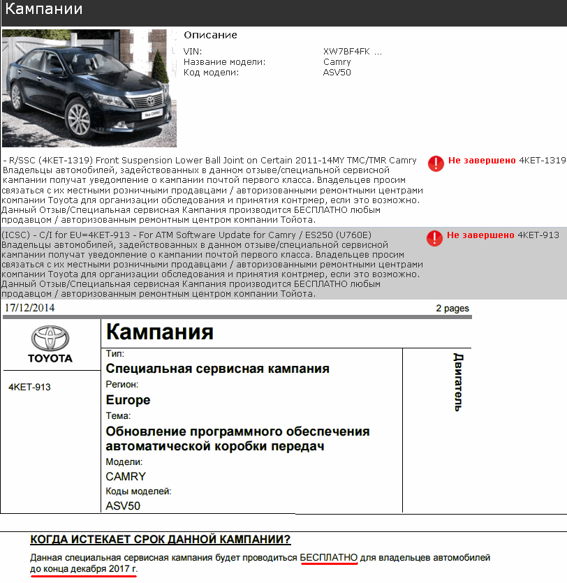 В аналогичной англо-язычной версии сообщается о том, что "this Incoming Customer Service Campaign will be available at NO COST to the vehicle owners until the end of 12/2017".