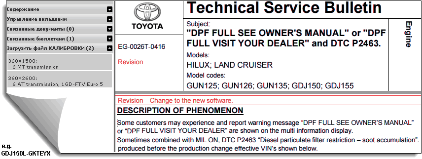 В прошлогоднем TSB ("DPF FULL SEE OWNER'S MANUAL" or "DPF FULL VISIT YOUR DEALER" and DTC P2463) описано как избавится от ложного появления такого сообщения и такого DTC у HILUX; LAND CRUISER Model codes: GUN125; GUN126; GUN135; GDJ150; GDJ155. После regenerate DPF, например, у LC установить ПО calibration ID: 360X1500 (6MT, Euro5) или 360X2600 (6A/T). А также, TSB "AC60 Automatic transmission shift shock 2nd-3rd , 4th-3rd gear": для GDJ150 1GD-FTV Euro6 - CID 360X4400, для GRJ150 1GR Euro5 - CID 360X7200