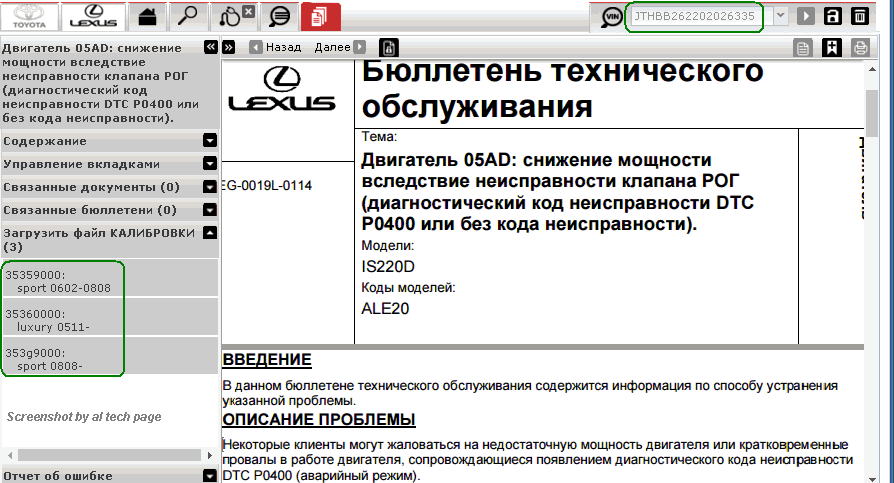 • EG-0001L-0110-EN ("Белый дым на выпуске") и EG-0036L-0210-EN ("Hard to start & Unstable idle after engine cranki") требуют для Lexus IS220d (ALE20), Minimum calibration Level: 35335600/35339600/353A3100.