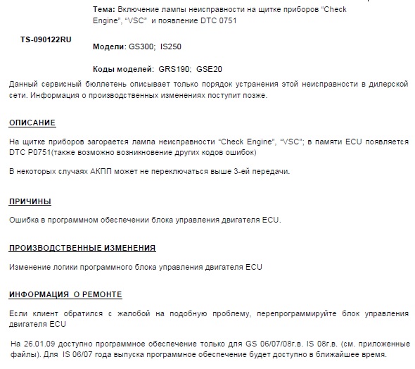 • CP-0010L-0609-EN "Невозможно переключение на более высокую передачу с 3-й передачи" (DTC P0751) Lexus GS300 (GRS190 2006-2008MY)/ Lexus IS250 (GSE20, 2006-2007MY)*.